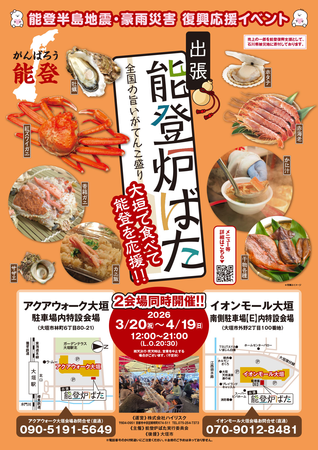 | 開催場所/連絡先 | ・アクアウォーク大垣 〒503-0015 岐阜県大垣市林町6丁目80−21 駐車場内特設会場 TEL.090-5191-5649 ・イオンモール大垣 〒503-0933 岐阜県大垣市外野2丁目100番地 南側駐車場【E】内特設会場 TEL.070-9012-8481 |